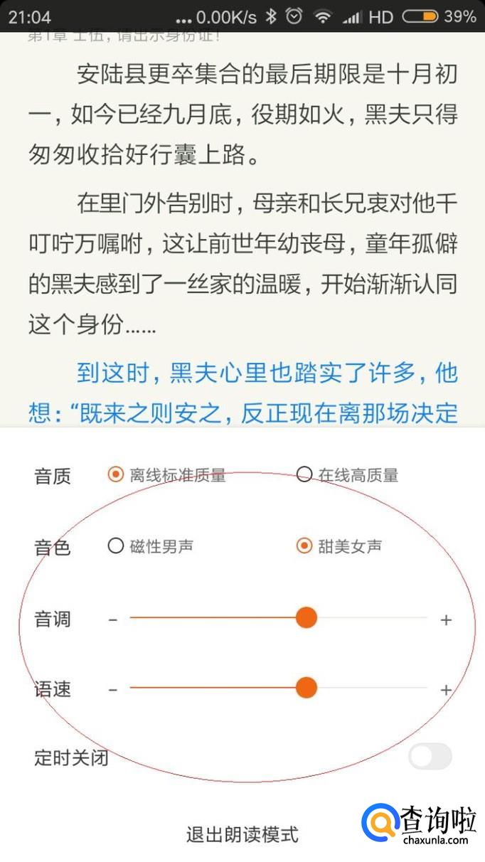如图所示,开启小说朗读模式。点击中间区域任意位置,唤出朗读设置选项界面。