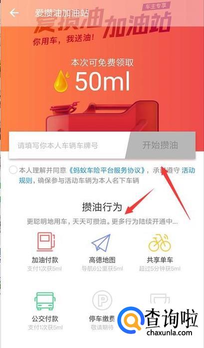 输入本人车辆车牌号可以攒油,攒油行为是加油付款、使用高德地图导航、使用共享单车、使用公交付款等,都可以获得5ML的汽油;