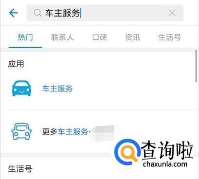 打开支付宝APP,在上方搜索栏中输入车主服务,并选择第一个应用;