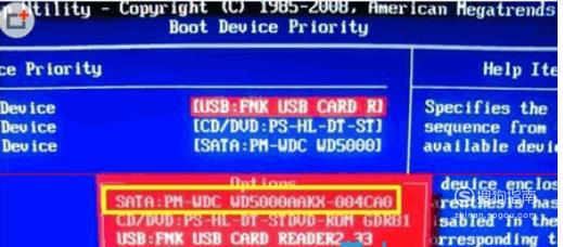 进入启动设备选项后,选择箭头所指的选项,设置硬盘为第一启动项。