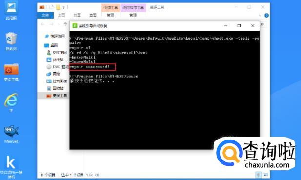 打开系统引导修复工具后,系统自动修复后会显示出repair successed的字样,这样就能成功修复完成,如下图所示。