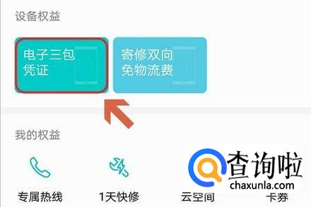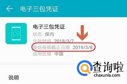 然后对应的页面中即可看到“电子三包凭证”,点击打开即可查看自己的这部手机预估的保修期限了,如图二...