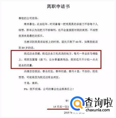 想去旅行:辞职理由很小资,世界大,想去看,虽然信中写的很文艺,但透着对现在工作和生活的失望。