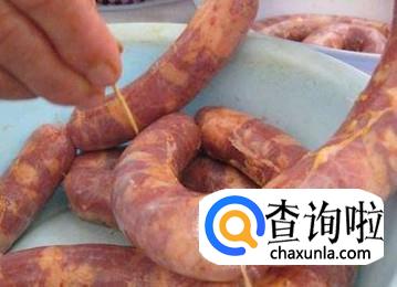 差不多保证一截香肠30cm左右,就用白线拴住分节,最后全部灌完以后,再用针把气泡戳破,这样我们的香肠就做好了,可以放在阴凉处风干,等以后要吃的时候取下来煮就可以了。