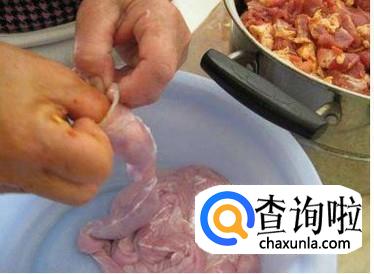 腌制好之后,把之前准备好的猪大肠(记住一定要用盐水写,这样才能洗得干净),使用漏斗将猪肉灌进去。
