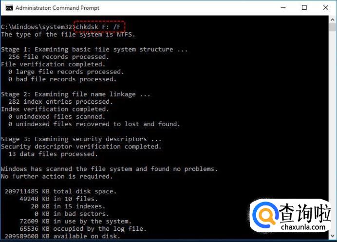 接下来在管理员界面中输入“chkdsk F: /f”。