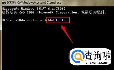 在这里以电脑上的实际情况为例,移动硬盘所处盘符为R,所以在弹出的黑框中,我们输入“chkdsk 移动硬盘所在盘符: /R”,如图所示。