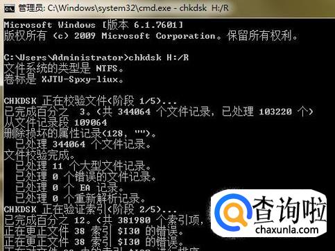 输入完之后,系统就会对其进行修复,硬盘中文件较多的话,修复过程可能会比较长,如图所示。