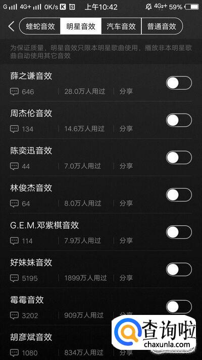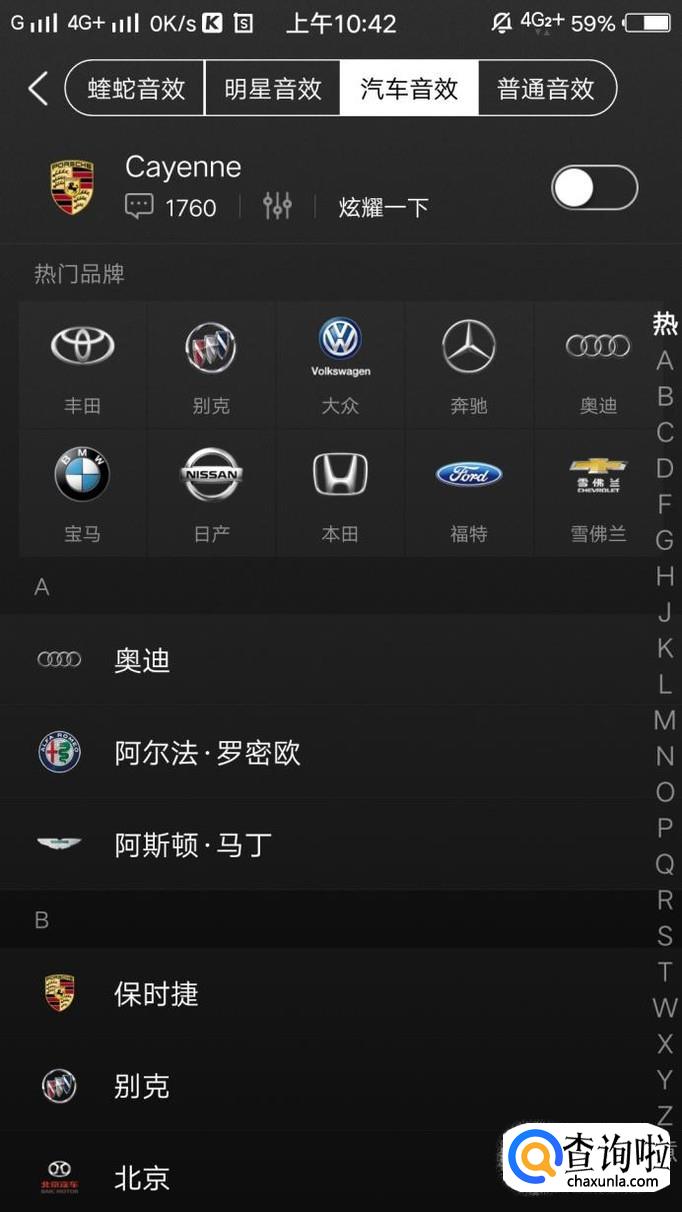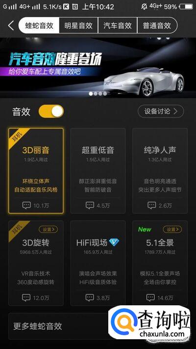 除了蝰音效果,在设置里面还可以加入明星效果和汽车效果。这样就听歌就可以有自己喜欢的歌星的效果,并且根据不同的车配置不同的音效。