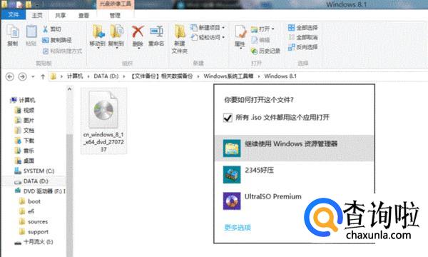右键ISO镜像-打开方式-选择使用Windows资源管理器打开ISO镜像,Windows 8会自动加载ISO镜像文件,这也是Win8自身的一个功能。