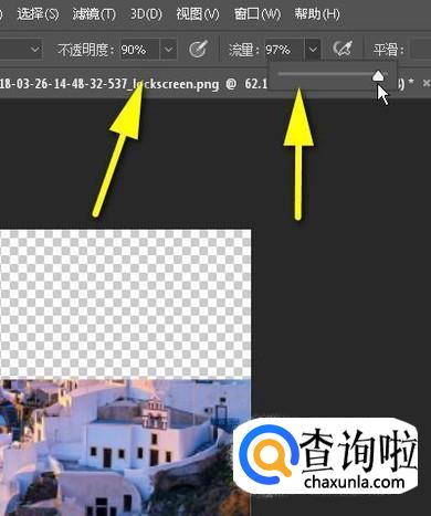 接着,再设置不透明度为50;流量为50;画笔再在这部分图像中涂抹。最后,设置不透明度为20;流量为50;画笔再在这部分图像中涂抹。现在图片局部就有了渐变透明的效果了。