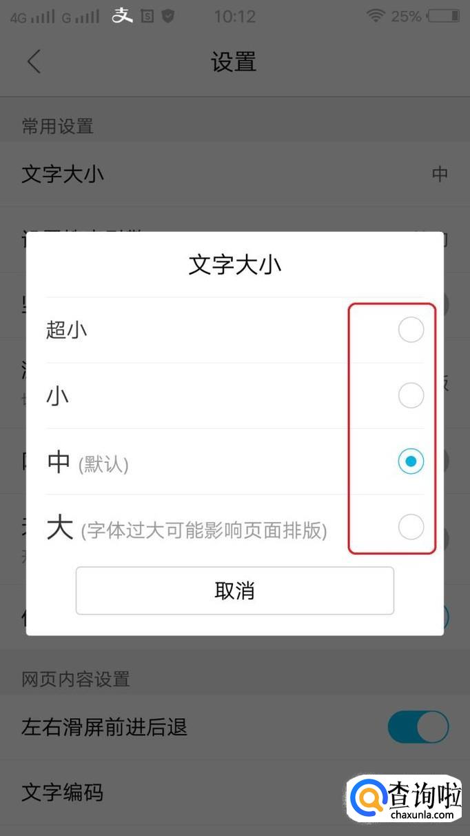当前大小为“中”,也可以设置“小”、“超小”、“大”等修改文字大小。