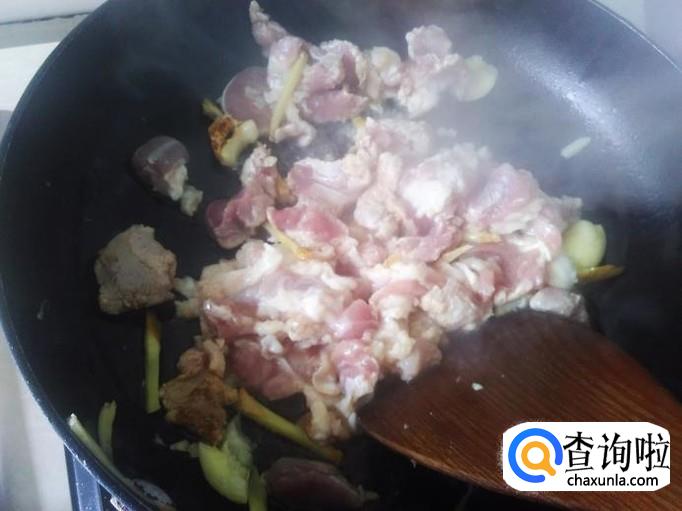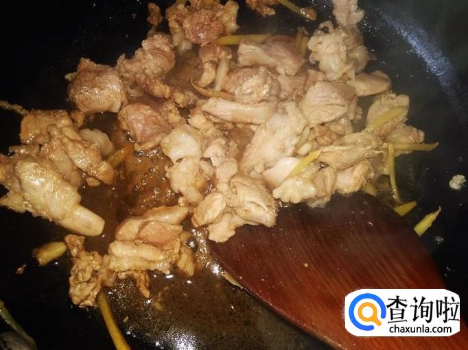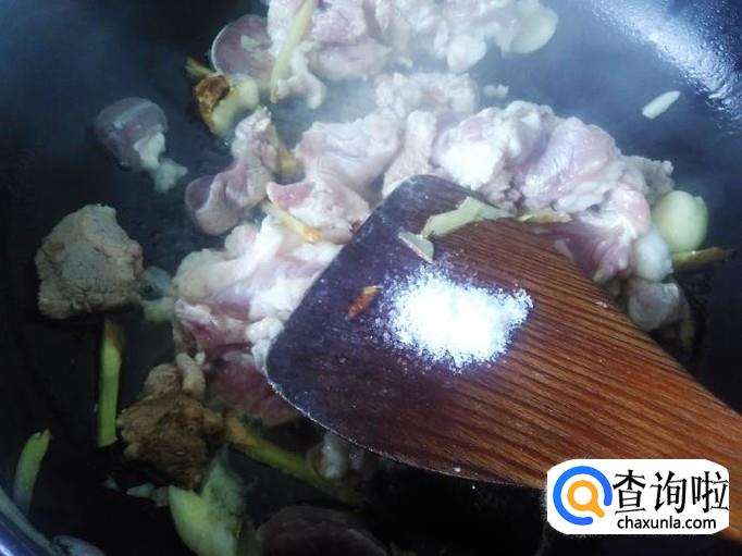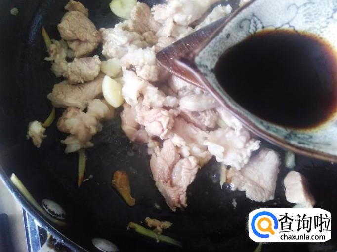 瘦肉下锅,加适量的盐、1勺生抽。