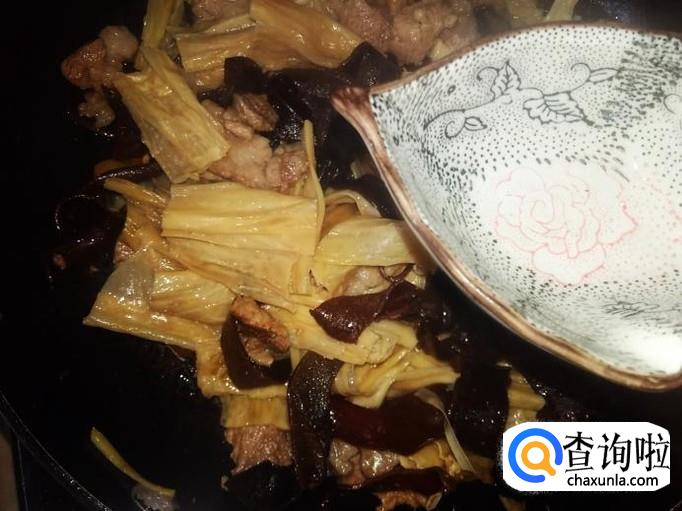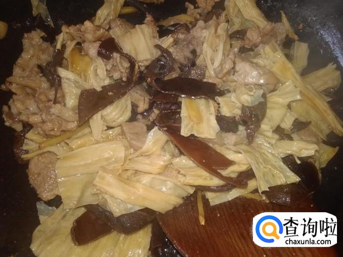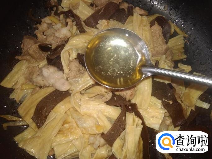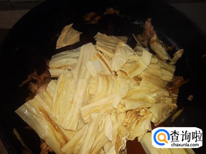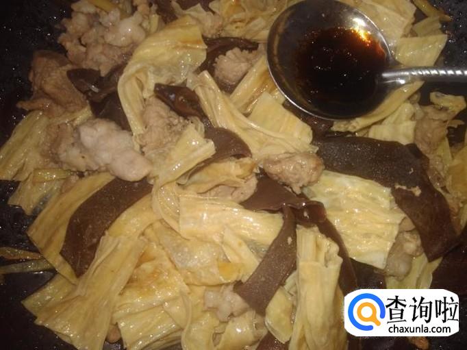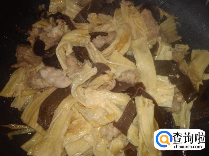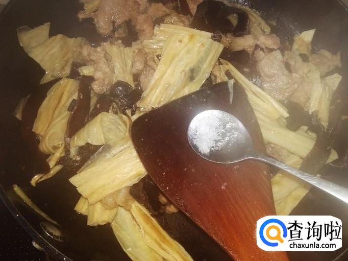 然后下腐竹、木耳进去加少量的盐翻炒一下。