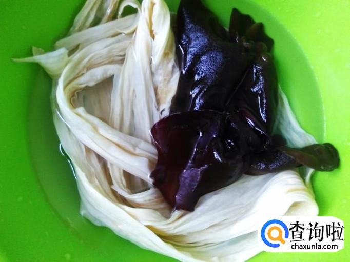 腐竹、木耳放到水里泡发30分钟左右。