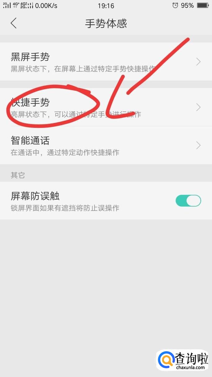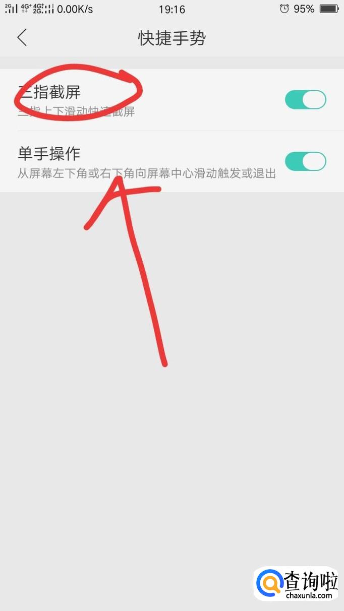 打开”三指截屏“,即可通过三指上下滑动截图。