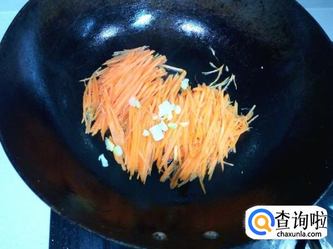 油热后放入胡萝卜丝,五香粉,葱,姜,盐,快速翻炒。