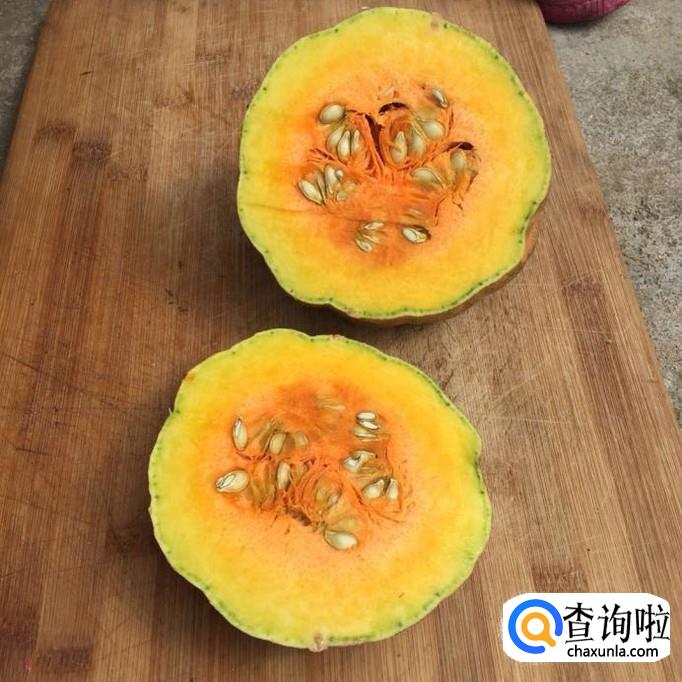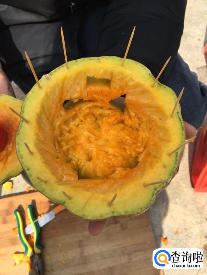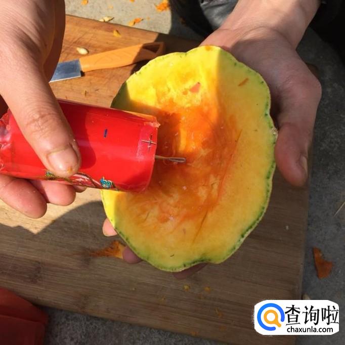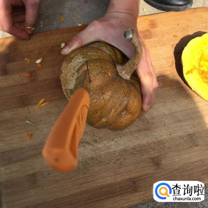 接着把上下两部分的南瓜籽用手掏去。为了让做出来的南瓜灯笼更加轻便,可以选择把部分的南瓜肉用刀切去。
