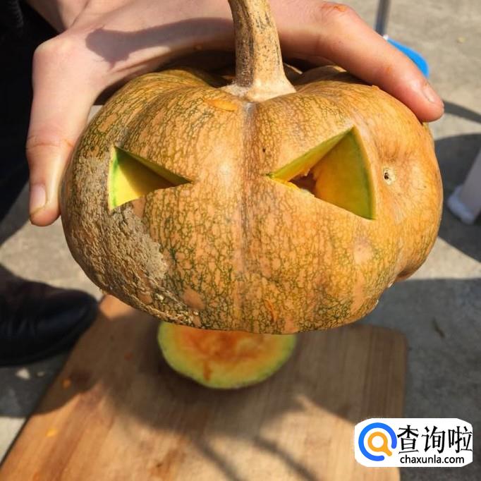 然后沿着南瓜的底部往上1/3的位置用刀切开,如下图所示。