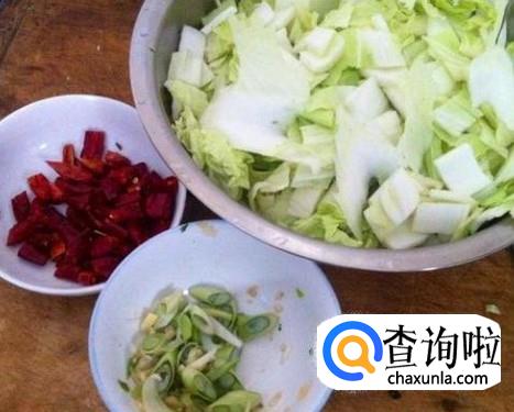 将白菜切成一寸大小的块,将辣椒和葱切成小段。