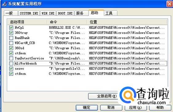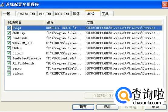 可以看到所有开机启动的程序,在这里把不需要开机启动的程序前面的对号取消,不认识的程序最好不要动。