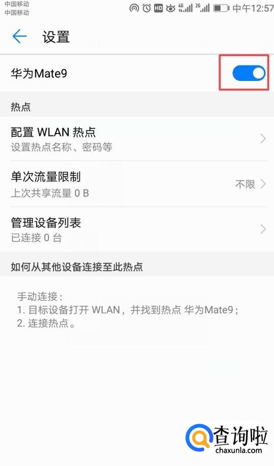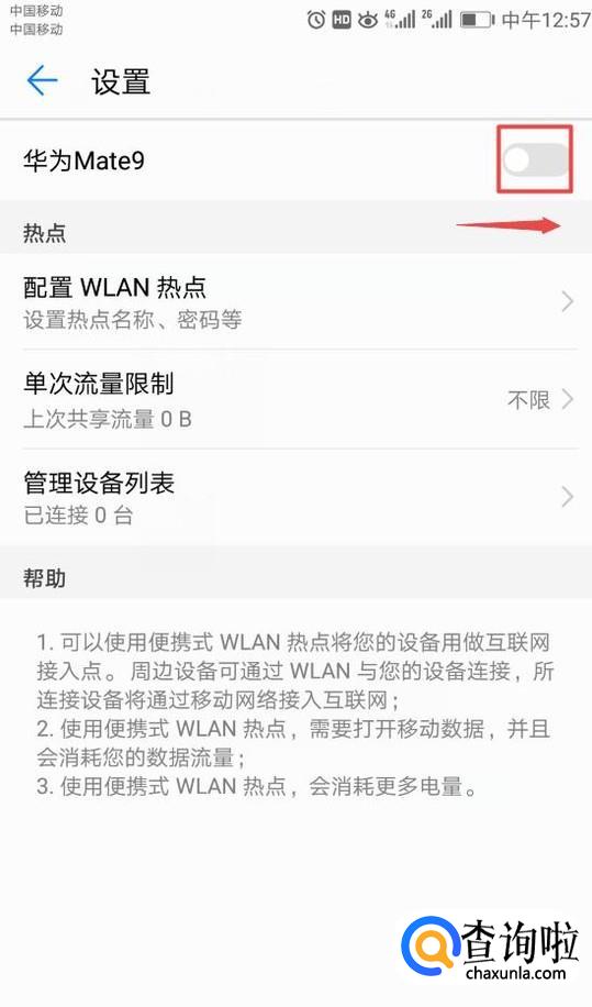 弹出的界面,我们将热点的开关向右滑动打开,这样就可以热点了。