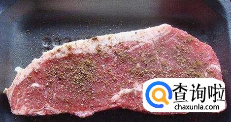 牛排解冻后,擦掉表面的水分,如果马上煎制的话,可以撒上一些盐和一些黑胡椒碎屑,自己用工具磨出来的黑胡椒会更有味道,再淋上一些橄榄油,就可以下锅煎制了;