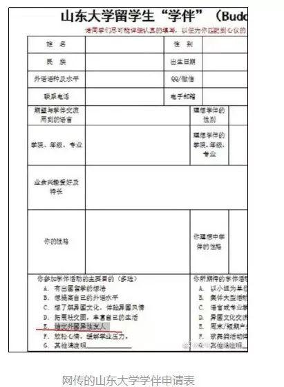网传的这份寻找学伴的申请表,分类很细,从专业到性别,到性格,到兴趣,到交友目的(比如“结交外国异性友人”)……十分全面,适合做数据库匹配。