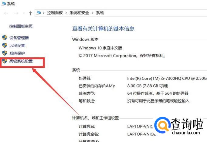 进入属性面板之后,点击高级系统设置。其实方式有很多,但是这里只介绍最方便的一种。
