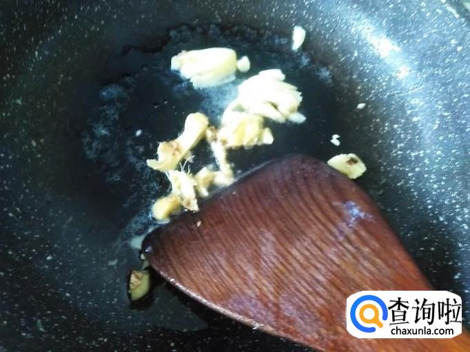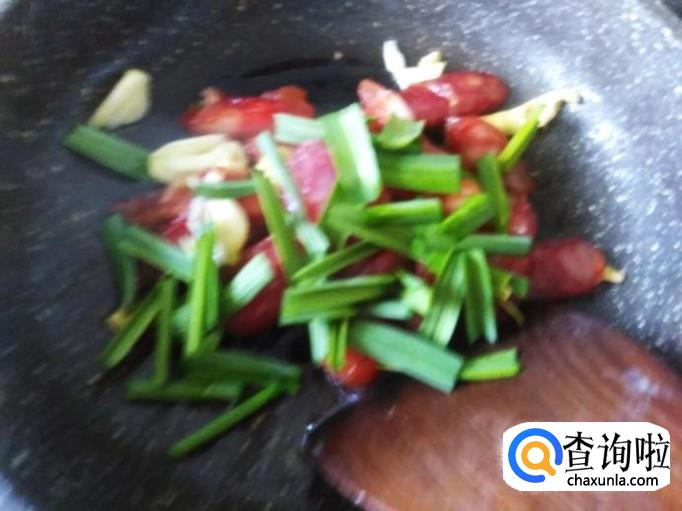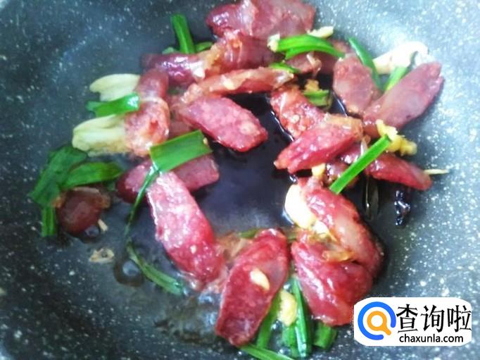 再开火下油,放蒜米、姜蓉进去爆出味来,腊肠下锅加青蒜翻炒一下。