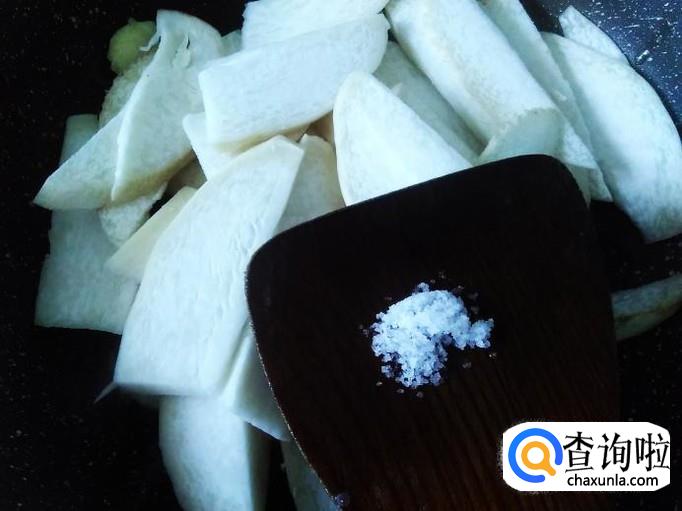 开火下油,放蒜米进去爆香,杏鲍菇下锅加适量的盐翻炒至软。