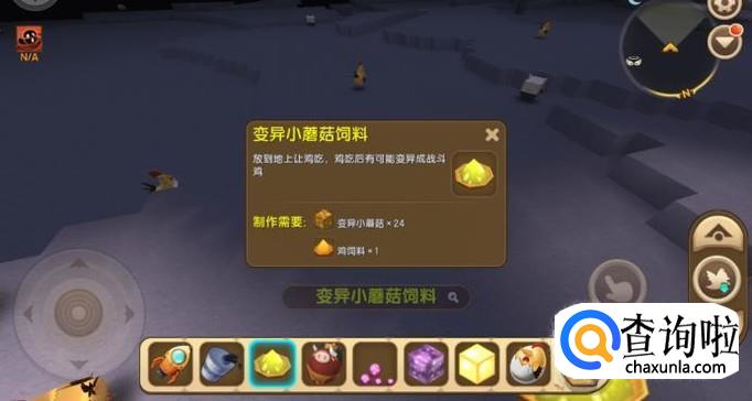首先我们需要制作一些变异小蘑菇饲料,然后让鸡食用,有几率让鸡变异成为战斗鸡。