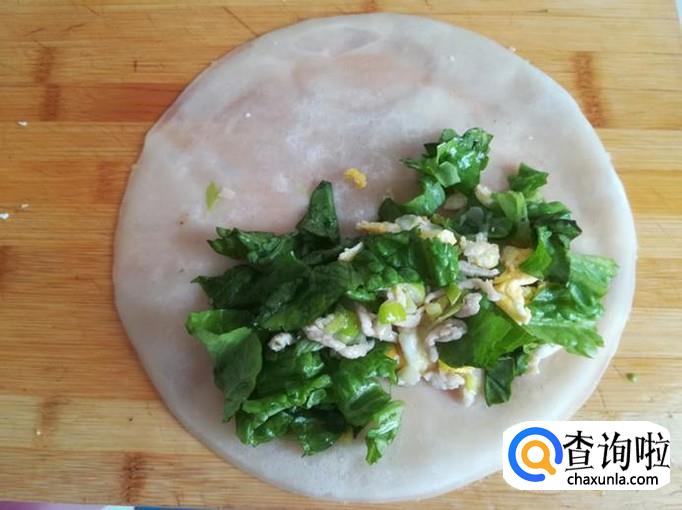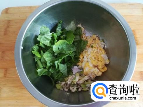 把鸡蛋炒散,生菜洗净撕成小片,熟鸡肉撕成丝,然后全部放入盆里,倒入葱油,搅拌均匀,做成蔬菜馅。