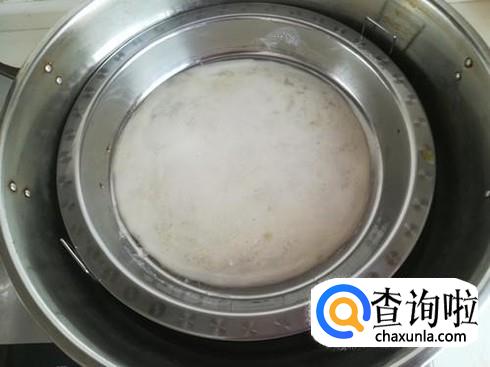 给蒸锅里加入多半锅水,大火把水烧开,再取一个蒸盘,给盘底滑一层胡油,放开水锅里加热,然后舀适量面糊倒入蒸盘中摊平,隔水蒸到面饼起泡为好,荞面饼就蒸熟了。