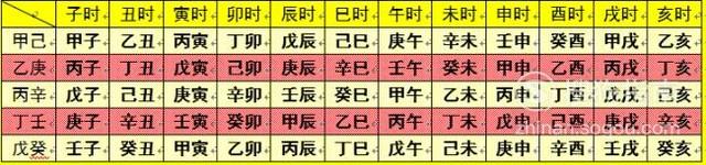 一天有12个时辰,23点到1点为子时,1点到3点为丑时,以此类推,需要注意的是23点即为一天的终结与另一天的开始。有一句专门推算日柱的歌谣叫“日上起时歌”,内容如下:甲己还加丙,乙庚丙作初,丙辛生戊子,丁壬庚子头,戊癸起壬子,顺推乙丑等,其意思会在下图得到详细的对应。比如2019年3月2日3时的时柱为癸丑。所以2019年3月2日3时的八字为己亥丙寅戊戌癸丑。