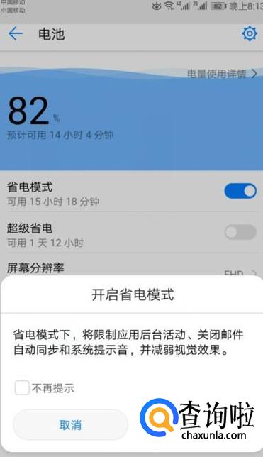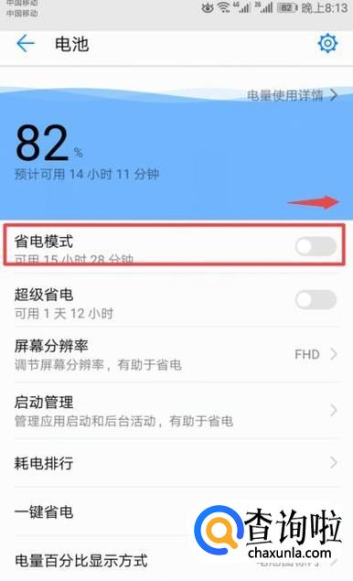 弹出的界面,我们将省电模式向右滑动;
