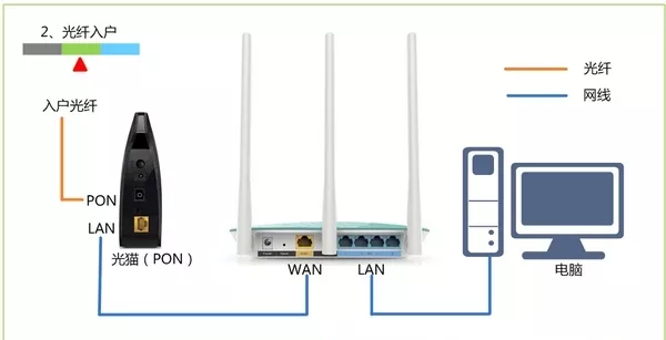 2、光钎上网:用户需要准备2根网线,其中一根网线用来连接光猫与路由器的WAN接口,另一根网线用来连接计算机与路由器的LAN接口(1/2/3/4中的任意一个都可以)。