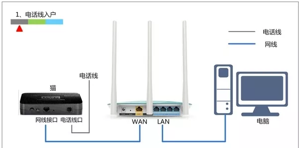 1、电话线上网:用户需要准备2根网线,一根网线用来连接ADSL Moden(猫)与路由器的WAN接口;另一根网线用来连接计算机与路由器的LAN接口(1/2/3/4中的任意一个都可以)。