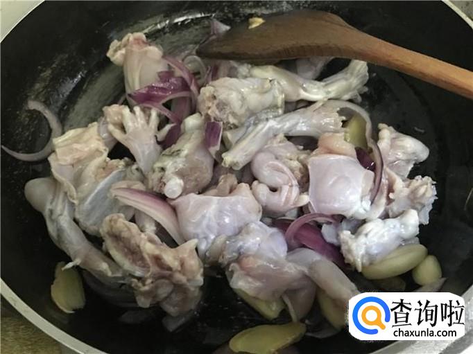 炒牛蛙。等到锅中的佐料都炒香了以后,将牛蛙放入锅中,然后用中火,慢慢翻炒牛蛙,让牛蛙和洋葱、大蒜和将的味道都融合在一起,这样会更好吃的。