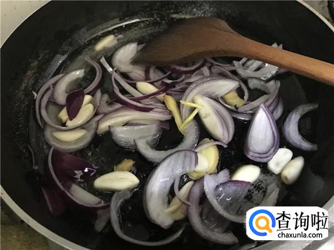 锅中热油,将洋葱炒香来。放入适量的油,然后将蒜头、姜和洋葱都放入锅中,接着用勺子来回炒香,这样能让牛蛙更加入味一些,会更加好吃。