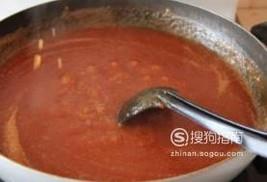 等番茄煎成糊状之后放入白砂糖继续煎制,煎的过程中不断用勺子搅拌,避免糊锅。