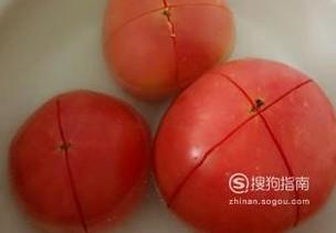 准备三个番茄,用刀在顶端划个十字,放入热水中泡一会儿,扒去外皮备用。