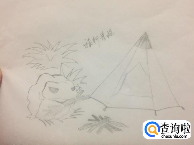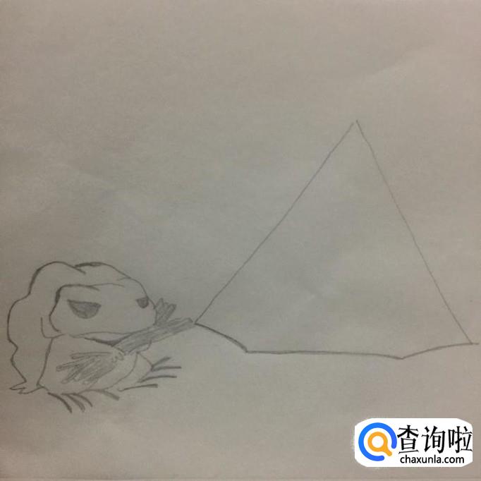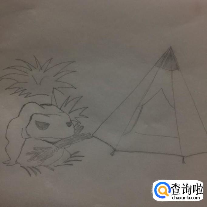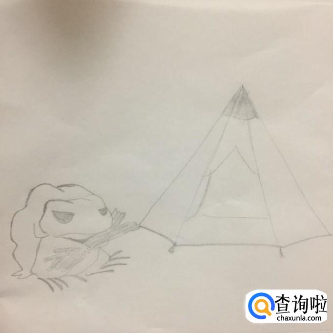 然后画出旅游青蛙旁边的帐篷轮廓,如下图所示。画这部分的时候可以画出一个三角形就可以了。
