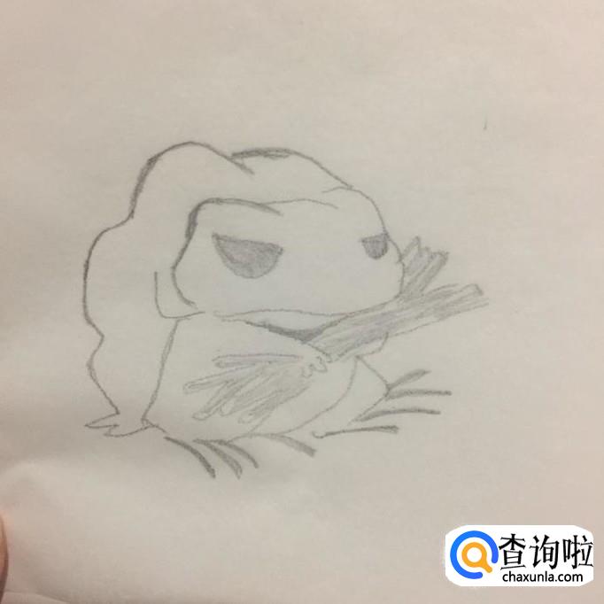 首先画出一只旅游青蛙,如下图所示。画这只青蛙的时候要特别注意他有着一头长长的头发且手上抱着一堆柴火。在画旅游青蛙眼睛的时候记得要用铅笔涂黑一下。