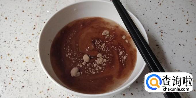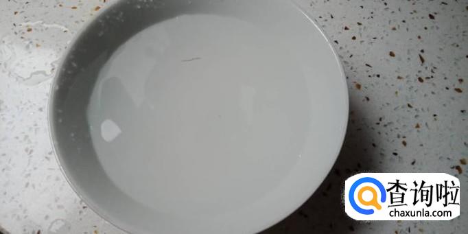 继续用碗盛水,不过这个时候只要一碗半就好,然后把买好的凉粉倒入在碗中搅拌,一直到全部都搅均匀为止。