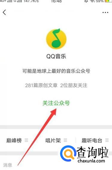 进入之后,搜索公众号“QQ音乐”,点击进入并关注,如图所示。