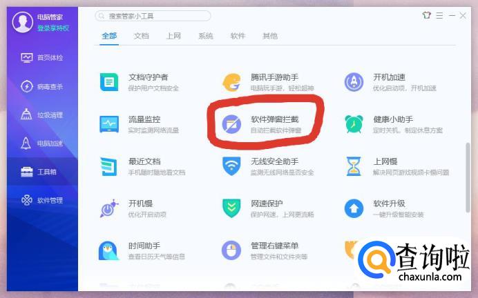 打开电脑安全软件,点击工具箱,找到并点击“软件弹窗拦截”。