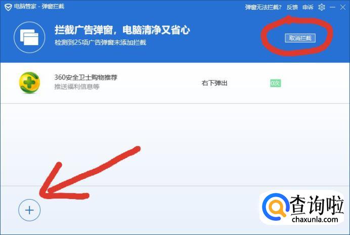 打开弹窗拦截页面会看到我们已经拦截的项目,不想拦截该项的话,可以点击右上角的“取消拦截”,若是想要添加拦截的项就点击左下方的+号按钮。
