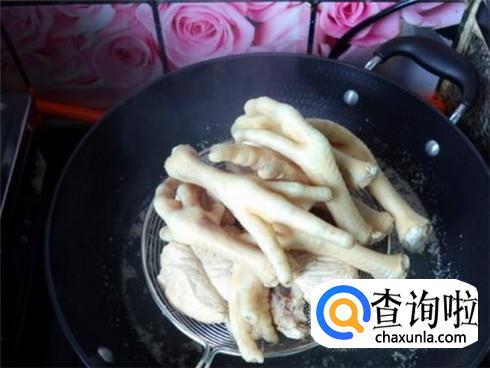 锅里烧清水,烧开之后把鸡脚放进去,用勺子翻几下,让鸡脚均匀受热,等到鸡脚变色的时候全部捞出来,并且快速放进凉水中。