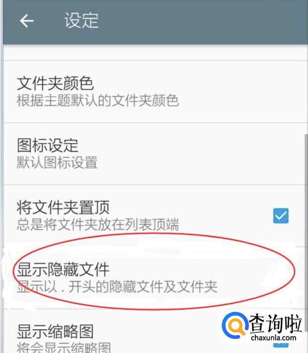 之后弹出菜单栏,找到并单击打开“设定”,之后再找到并打开“显示隐藏文件”。